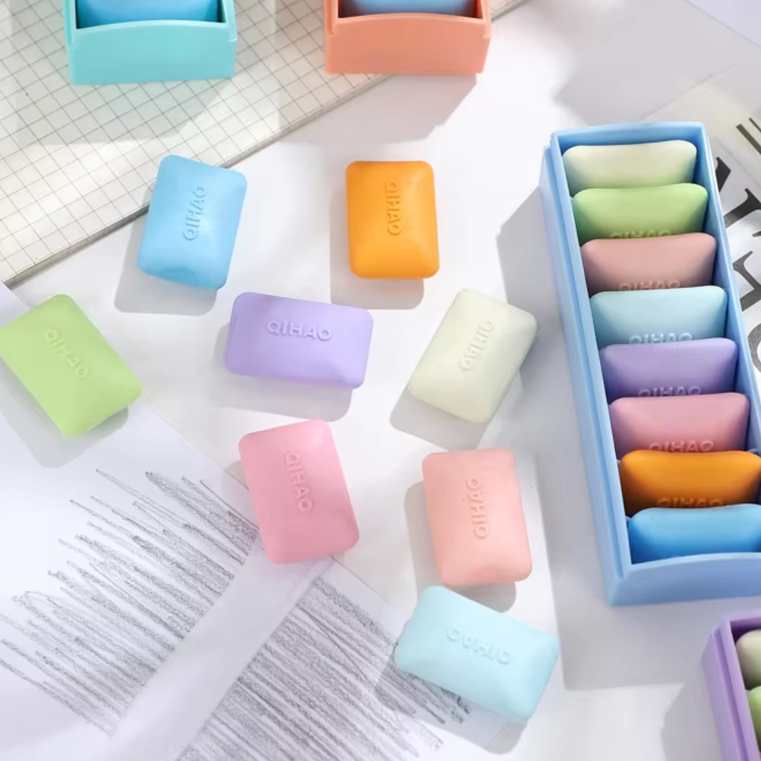 - Incluye 8 gomas cuadradas en suaves colores pastel: rosa, lila, amarillo, verde, celeste y más.